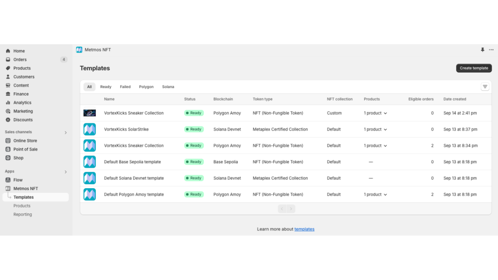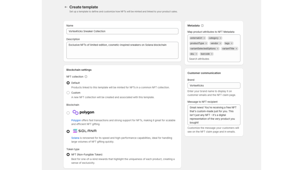 Think of a Template as a preset configuration in our app that automates the creation and distribution of NFTs linked to the products in your store. Each template serves as a recipe that details how NFTs are minted, what data they include, and how they’re presented to customers when they make a purchase.